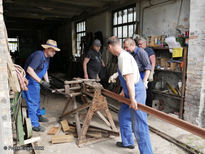 ![]() Der Gegenzug auf dem Weg Richtung Südgrube. | ![]() Die Diema DL8 vor den Zieglerhäusern. | ![]() Schienenbiegen wie schon vor 100 Jahren: Mit der Handbiegemaschine! | ![]() Fachkundige Erläuterung des früheren Feldbahnbetriebs. | ![]() Kipplorenzug mit Jung EL 110 im Bereich der früheren Südgrube. |