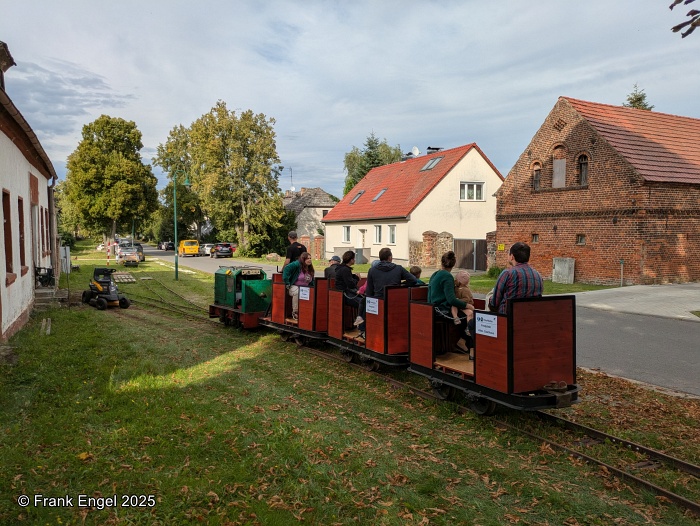 ![]() | 30. August 2025 Das kürzliche Freischieben des Geländes der mit Bauschutt verfüllten Südgrube förderte eine Reihe von DDR-typischen Schlackesteinen zu Tage, die wir als Begrenzungssteine bargen. Erstaunlicherweise kam dabei eine ganze Ladung zusammen, die standesgemäß per Zug befördert wurde. | ![]() | 13. September 2025 Für das diesjährige Herbstfest in Garzin hatte der örtliche Feldbahnfreund Chris Deichen den Aufbau einer 450 m langen, teilweise sogar zweigleisigen Feldbahnstrecke vom ehemaligen Dorfgasthof ("Konsumgastgätte Zum grünen Baum") bis zum Festplatz organisiert. Auf dieser Strecke fand den ganzen Tag ein intensiver Zweizugbetrieb statt, den wir vom Ziegeleibahnverein Herzfelde mit einer kompletten Zuggarnitur nebst Personal unterstützten. Der Einsatz aller Beteiligten wurde durch sehr schönes Wetter und eine rundum gelungene Veranstaltung belohnt. Weitere Bilder... |