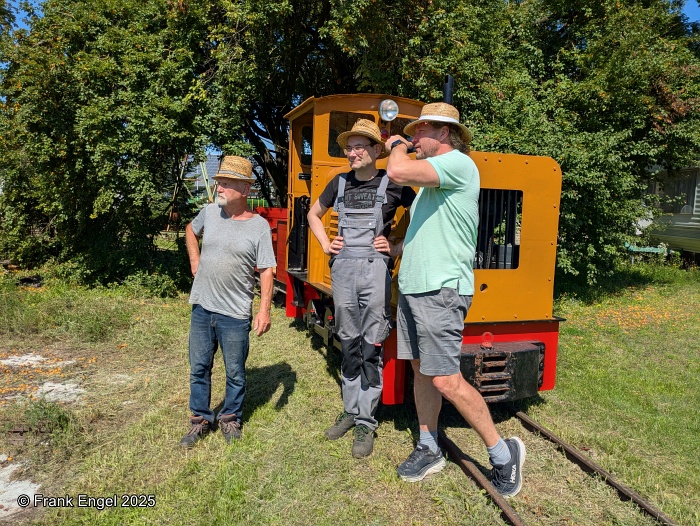 ![]() | 20. Juni 2025 Abschied: Zwei mehrjährige Gastloks haben heute Herzfelde verlassen. Während die Woltersdorfer EL110 zuletzt immerhin drei Jahre am Stück hier war, kam die Petershagener DL8 sogar auf gut zehn Jahre! Das Bild zeigt sie am Vortag beim letzten gemeinsamen Rangieren. | ![]() | 21. Juni 2025 Beim heutigen Rückbau der mobilen Streckenverlängerung lief zwar alles perfekt und die Arbeit war in 1,5 Stunden erledigt, allerdings hatten wir die sommerliche Hitze ziemlich unterschätzt: Unser Drei-Mann-Team war am Ende restlos erschöpft, aber wenigstens glücklich! |